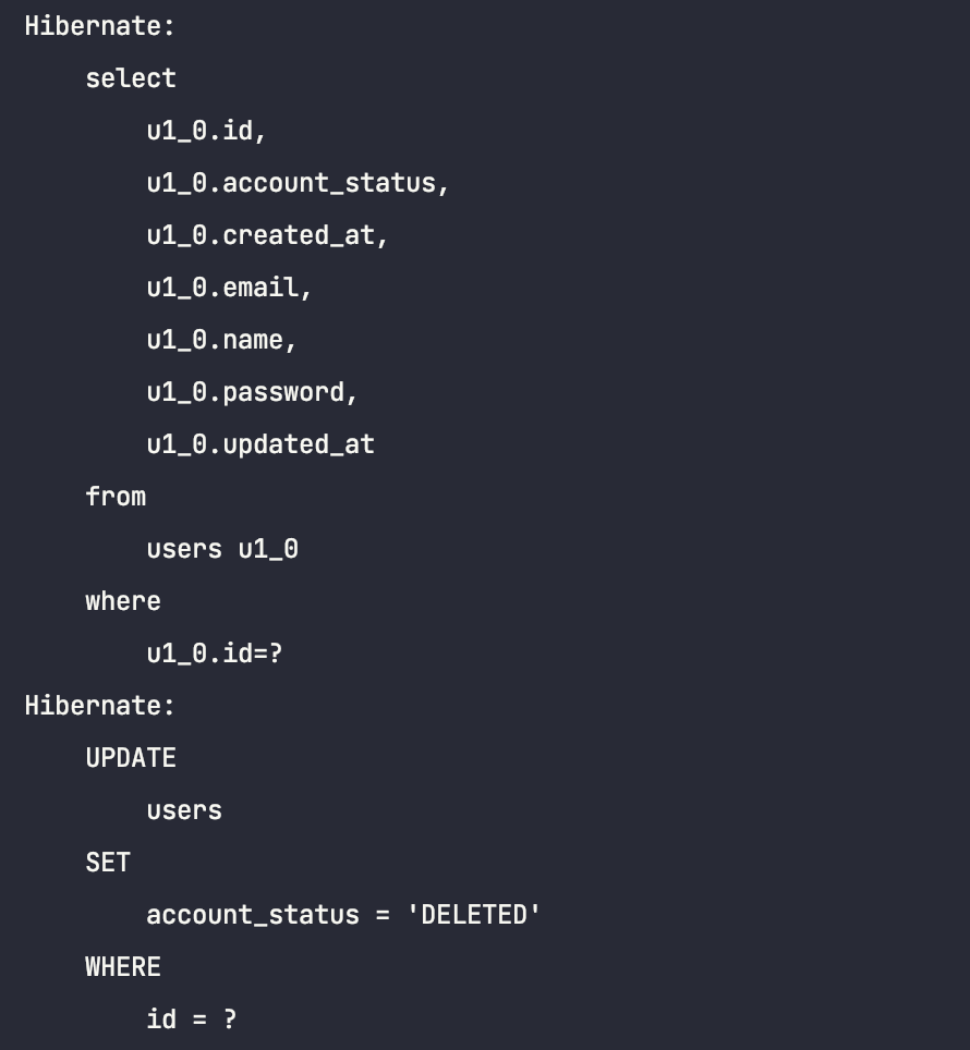 @SQLDelete(sql = "UPDATE users SET deleted_at = NOW() where id = ?")