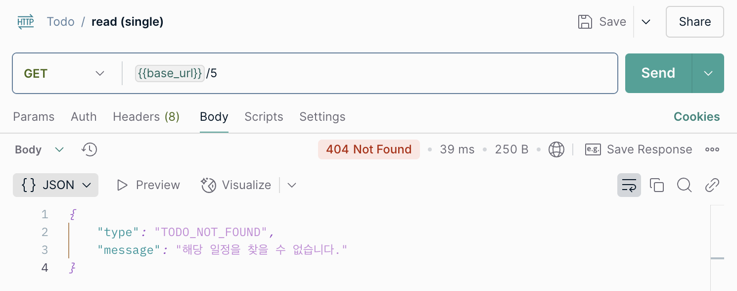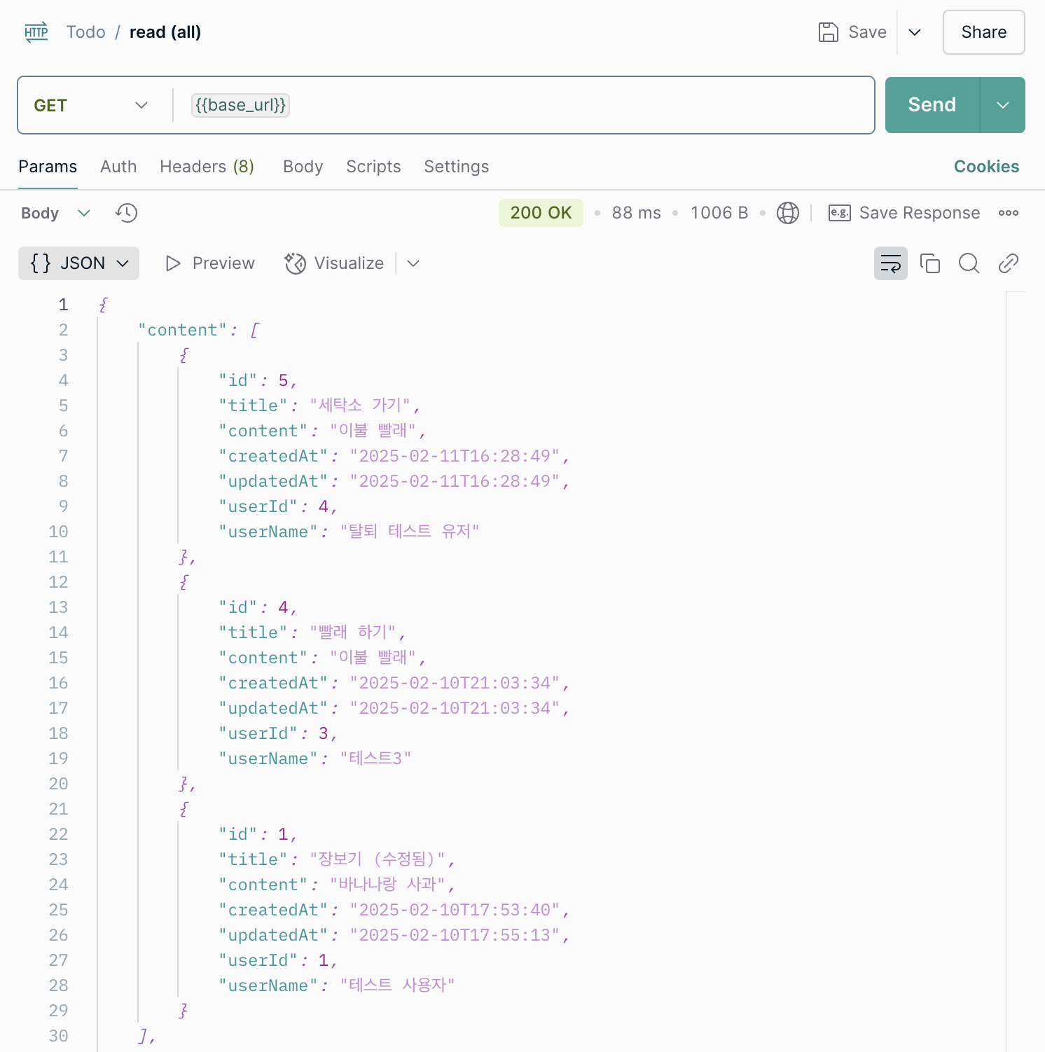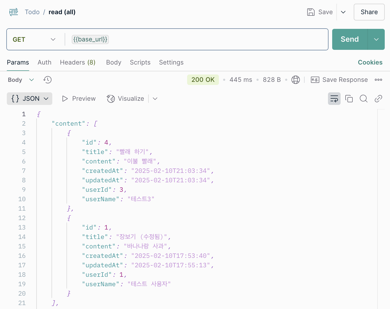 전체를 조회하면 아래와 같이 방금 생성한 Todo가 포함되어서 잘 나온다.