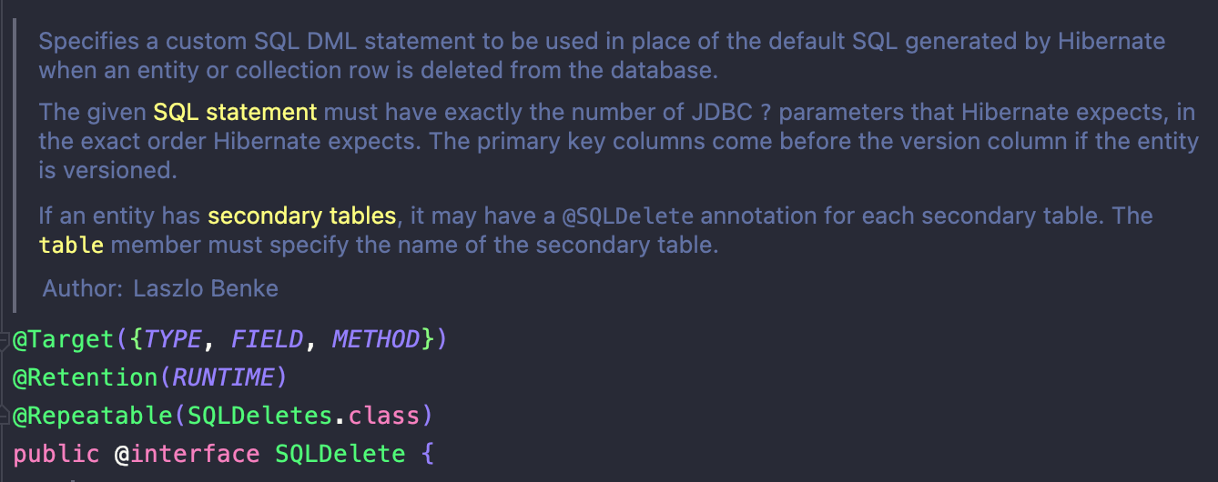 ``@SQLDelete`` 어노테이션을 사용하면 해당 엔티티를 삭제할 때 무조건 직접 지정한 SQL문이 실행된다.