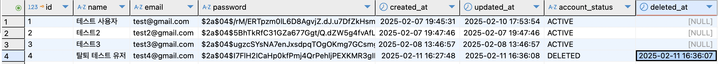 예상대로 잘 deleted_at이 설정되었고, users 테이블의 경우 account_status까지 업데이트 되었다.