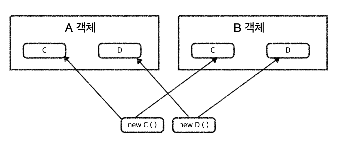- 객체 재사용 : 하나의 인스턴스를 여러 클래스에서 공유 가능하다.