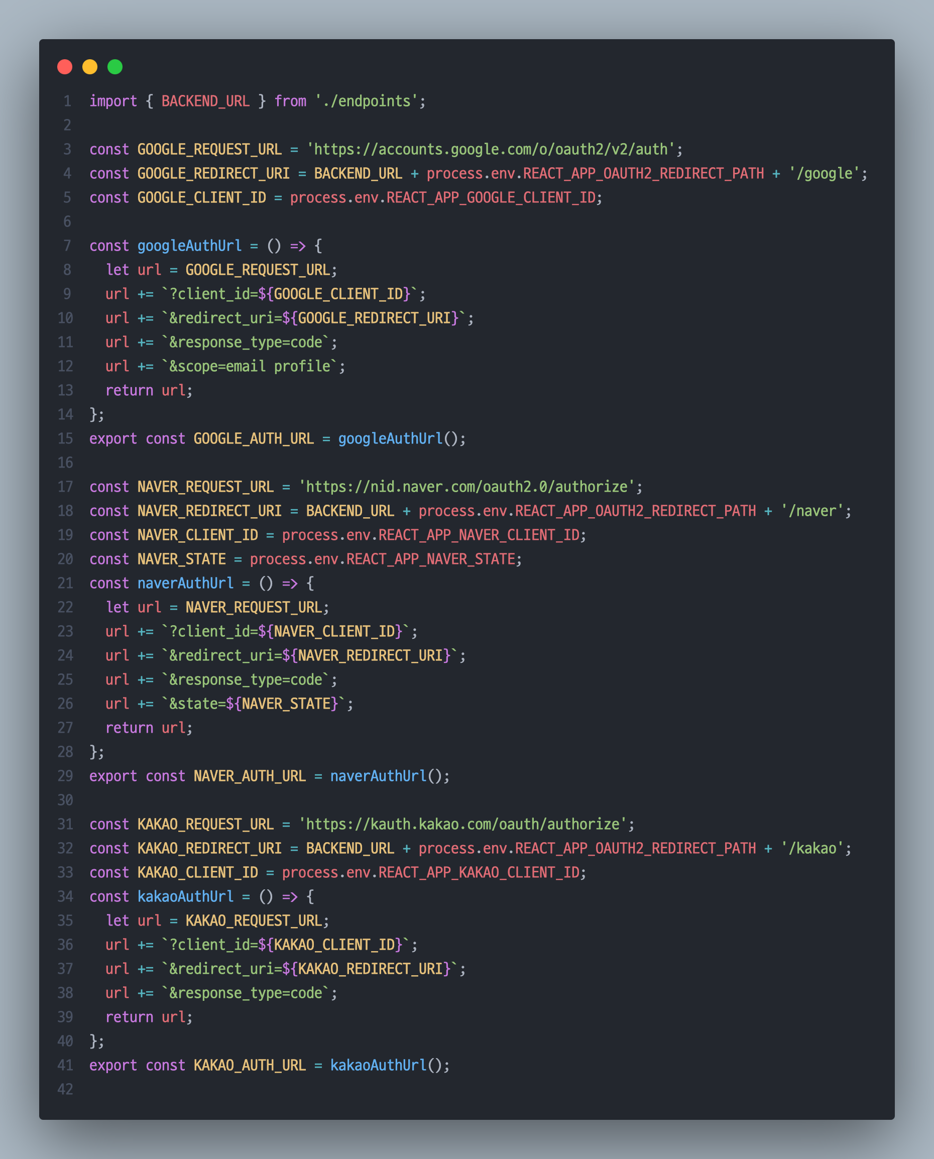 이 REDIRECT_URI에는 각 Provider에서 client id, secret을 받기 위해 어플리케이션 등록을 할 때 함께 설정한 redirect_uri와 동일한 주소를 입력해주어야 한다.