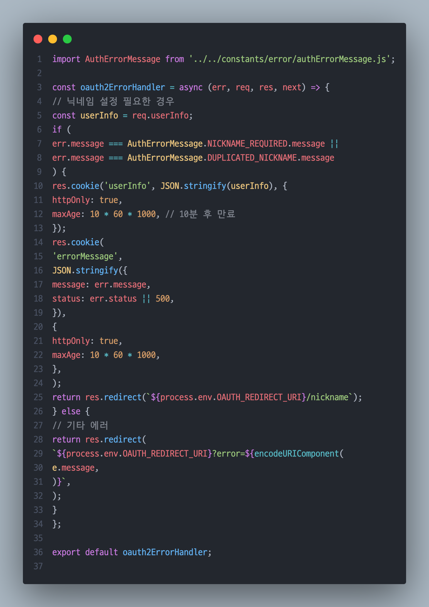 보다시피 oauth2Middleware -> OAuthController -> (에러 발생 시) oauth2ErrorHandler 로 이동한다.