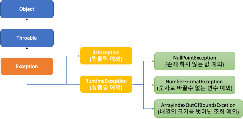그림에서 볼 수 있듯이, 'RuntimeException'과 이를 상속하는 Exception들은 컴파일러가 예외 처리 여부를 검사하지 않는다.