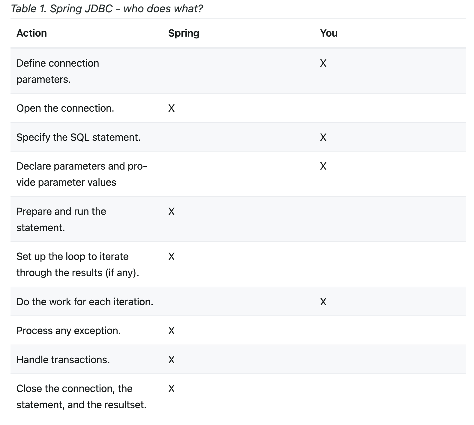 Spring JDBC는 JDBC 작업을 더 쉽게 도와준다.