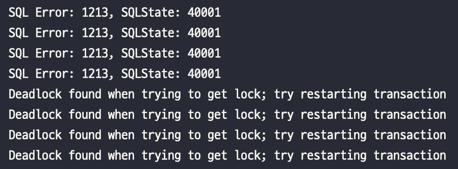 즉, 중복 생성은 발생하지 않았지만 데드락이 발생한 후 대부분의 요청이 롤백 처리되어 단 하나의 요청만 성공한 것이다.
