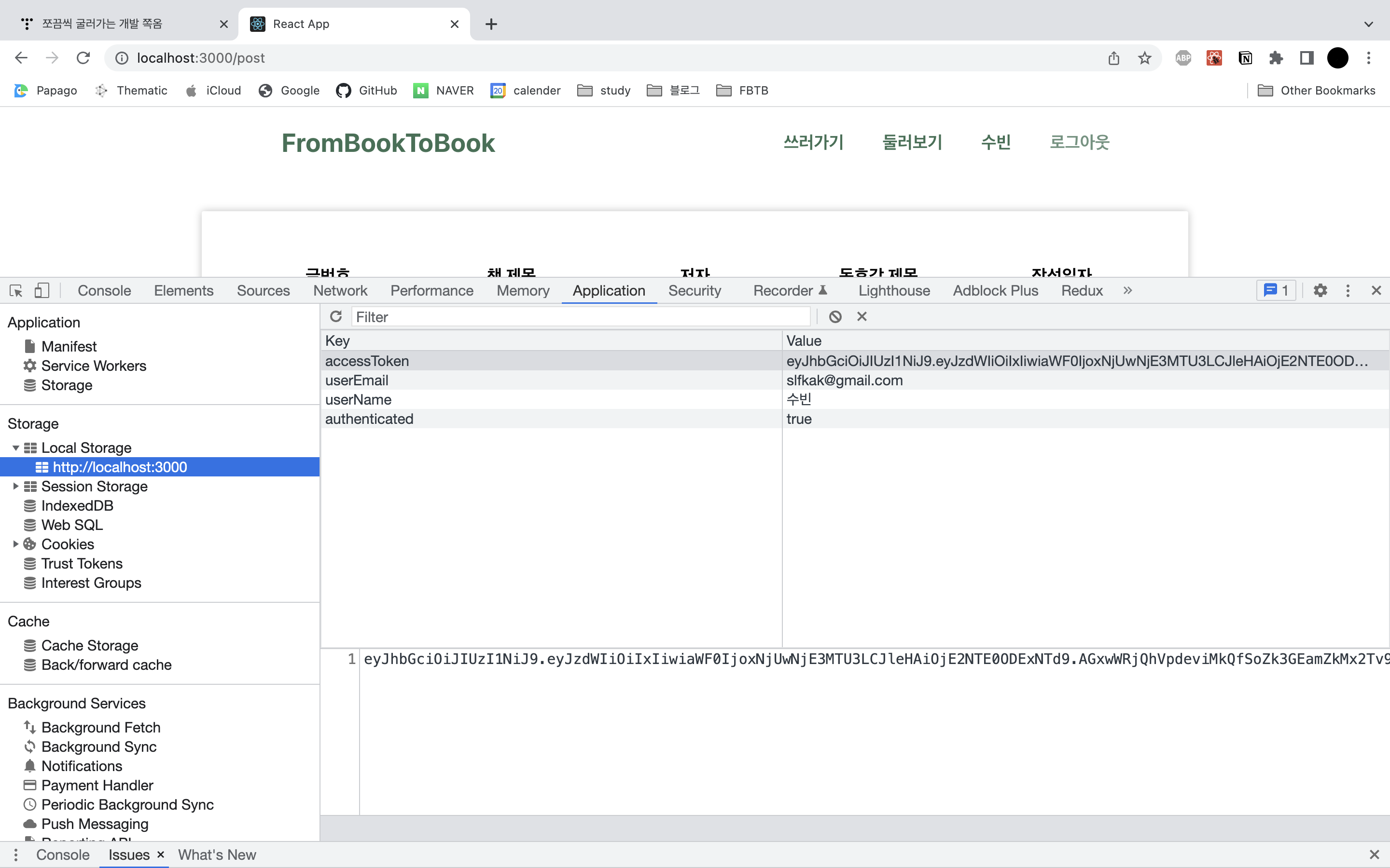 로그인 된 경우 local storage를 살펴보면 access token과 로그인 중인 사용자의 email, name 등이 들어가있는 것을 확인할 수 있다.